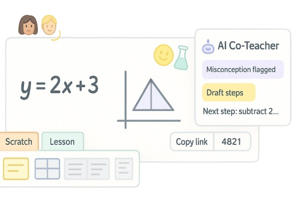 AI Co-TeacherChat with an assistant on the board. It reviews steps, highlights likely misconceptions, and suggests explanations and next tasks. You decide what to show.